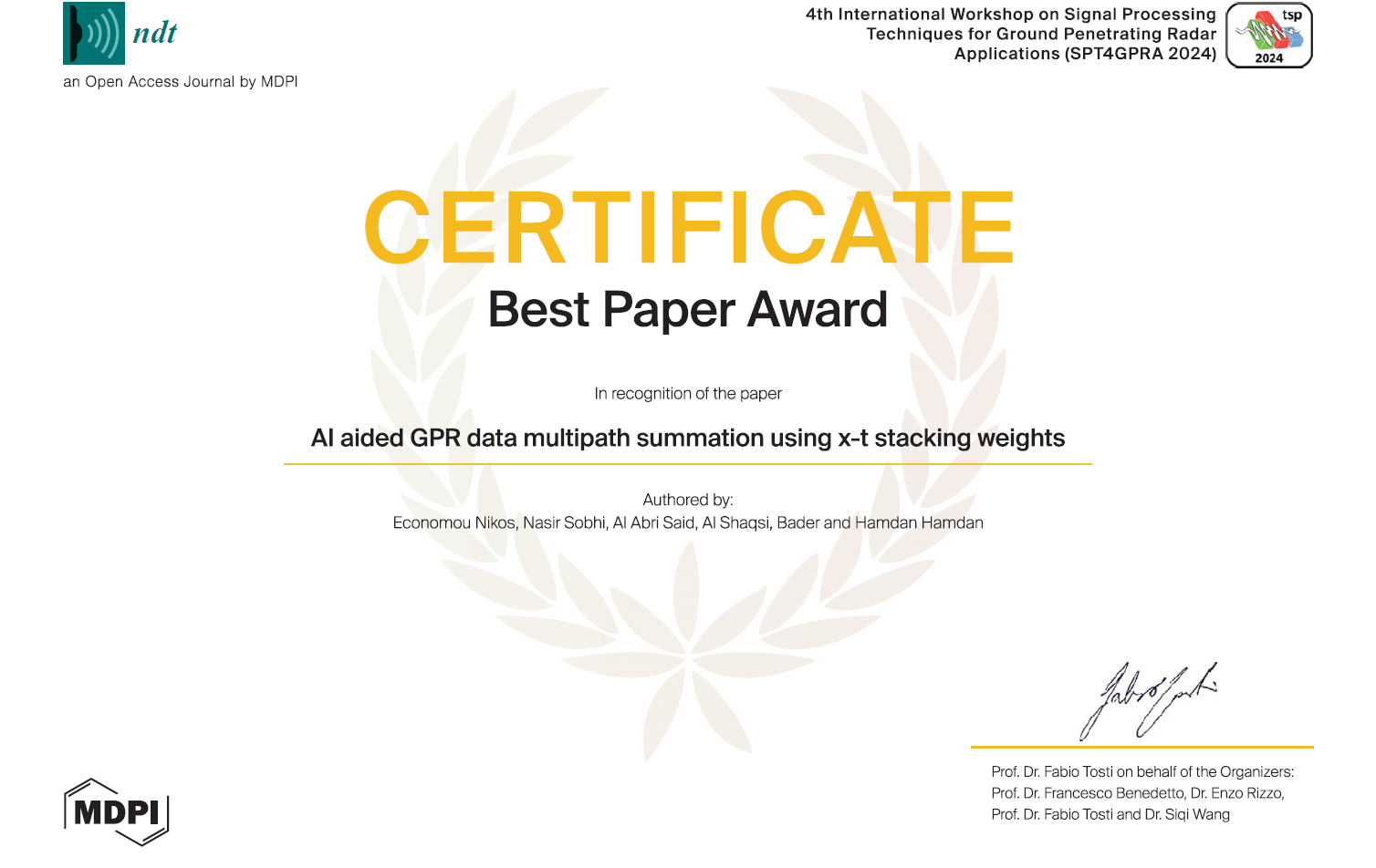 The paper entitled “AI aided GPR data multipath summation using x-t stacking weights” by Dr. Nikos Economou, Applied Geophysics Lab., School of Mineral Recourses Engineering, Dr. Sobhi Nasir, Said Al Abri, Bader Al Shaqsi, from the Earth Sciences Department, of the Sultan Qaboos University, Muscat, Oman and Dr. Hamdan Hamdan, from the Department of Applied Physics and Astronomy, Sharjah University, UAE, has been awarded the Best Paper Award by the organizing Committee of the 4th International Workshop on Signal Processing Techniques for Ground Penetrating Radar Applications, of the 47th International Conference on Telecommunications and Signal Processing-2024. This paper described a methodology for assessing marble quarries using GPR data processing and imaging techniques aided by Artificial Intelligence.
